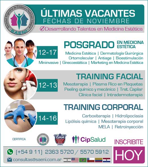 La Sociedad Argentina de Estética y Nutrición (SAENI) informa que están disponibles las últimas vacantes para los tres cursos de formación que dictará durante el próximo mes de noviembre en su sede de la ciudad de Buenos Aires, ubicada en Av. Rivadavia 4447, piso 2°, en la ciudad capital de la Argentina.